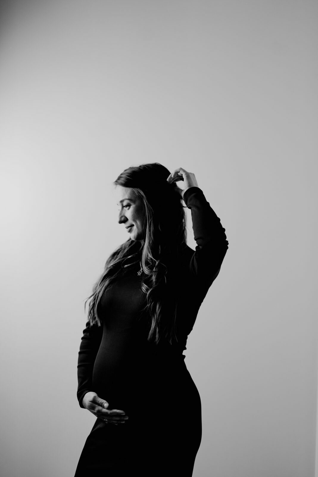 Um casal, uma gestante, dentro do estúdio, sentindo-se em casa.